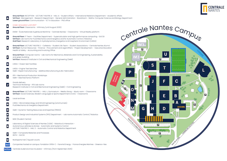 From the train station From the north exit of the station, take the tram line 1, towards F. Mitterand. Get off at the Commerce stop. To get to Centrale Nantes, take tram Line 2, towards Orvault Grand-Val, and get off at the Ecole Centrale/Audencia stop. Centrale Nantes is right next to the tram stop. One ticket costs €1.80. It is valid for one hour after you stamp it and can also be used on the regular bus and trams. Most of the university residences are located two tram stops after Ecole Centrale/Audencia. From the airport Nantes Atlantique international airport is situated about 10 km southwest of Nantes. There is a Tan shuttle bus (navette aéroport) which for €9 will take you downtown, either to the train station or to Place du Commerce. From here you can take tram line 2 as above. A taxi from the airport - the easiest option - will cost about €50. You can take a taxi from the rank in front of the airport or book ahead. The campus is accessible by car, with parking facilities available. The campus is equipped with covered bicycle shelters at several points and is easily accessible by bike. Centrale Nantes Reception The reception desk is located on the ground floor of building A. The school is open to the public from 7.50 AM to 6.15 PM Monday to Friday during term time. Parking is available on campus - see the campus map below.