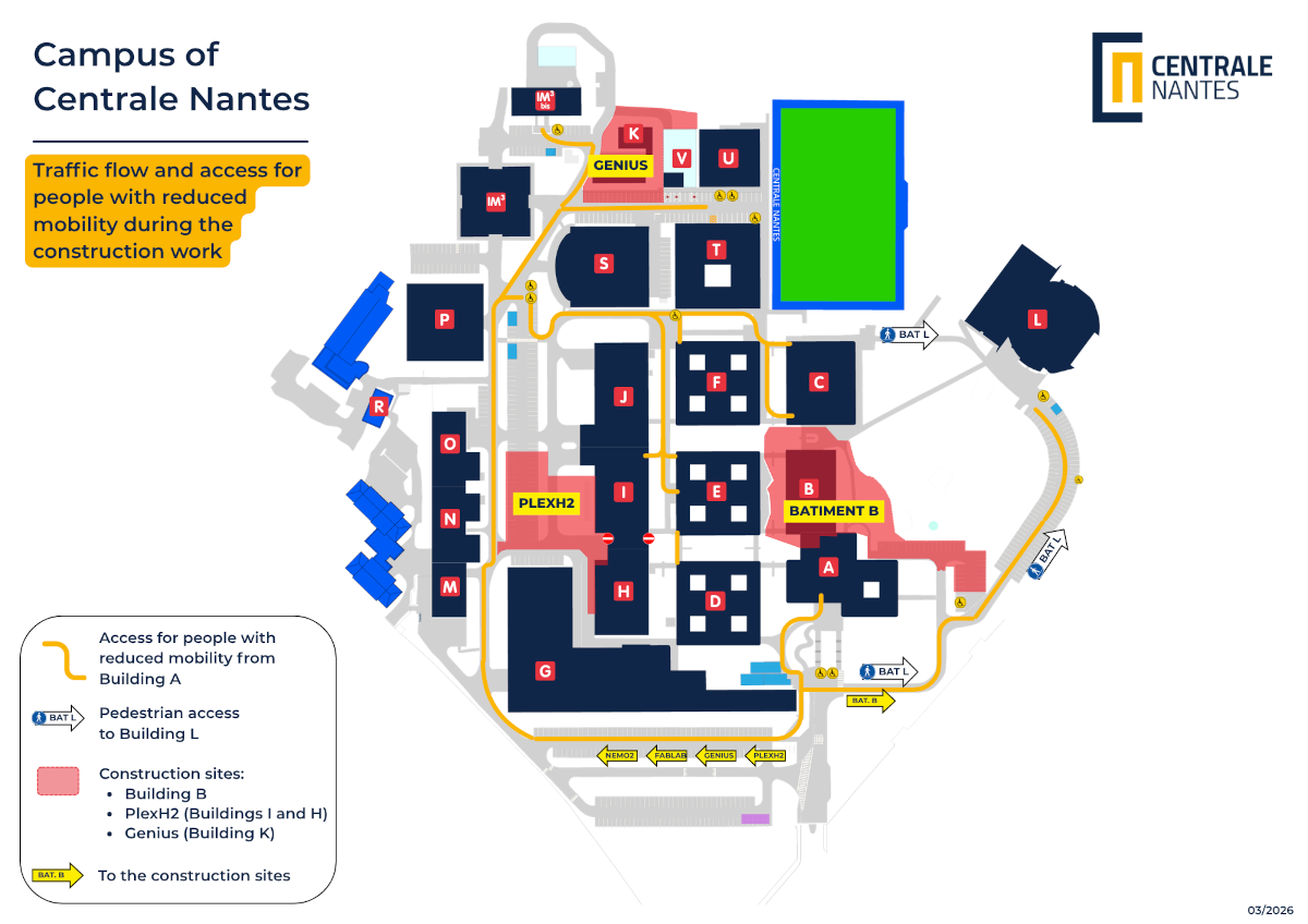 From the train station From the north exit of the station, take the tram line 1, towards F. Mitterand. Get off at the Commerce stop. To get to Centrale Nantes, take tram Line 2, towards Orvault Grand-Val, and get off at the Ecole Centrale/Audencia stop. Centrale Nantes is right next to the tram stop. One ticket costs €1.80. It is valid for one hour after you stamp it and can also be used on the regular bus and trams. Most of the university residences are located two tram stops after Ecole Centrale/Audencia. From the airport Nantes Atlantique international airport is situated about 10 km southwest of Nantes. There is a Tan shuttle bus (navette aéroport) which for €9 will take you downtown, either to the train station or to Place du Commerce. From here you can take tram line 2 as above. A taxi from the airport - the easiest option - will cost about €50. You can take a taxi from the rank in front of the airport or book ahead. The campus is accessible by car, with parking facilities available. The campus is equipped with covered bicycle shelters at several points and is easily accessible by bike. Centrale Nantes Reception The reception desk is located on the ground floor of building A. The school is open to the public from 7.50 AM to 6.15 PM Monday to Friday during term time. Parking is available on campus - see the campus map below.