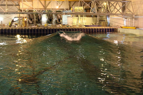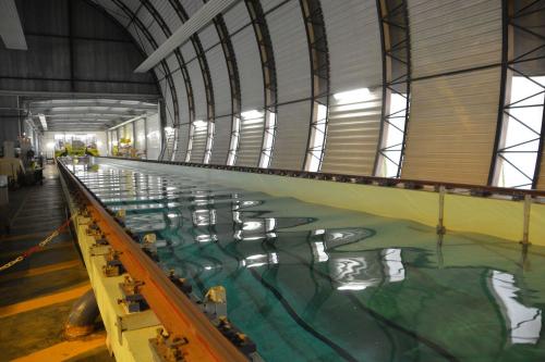 50 m long by 30 m wide and 5 m deep, the hydrodynamic and ocean engineering tank is equipped with a segmented wave beater composed of 48 independent flaps to generate directional waves. This tank is used for small-scale physical simulation of floating systems, navigating or anchored in open seas (ships, MRE systems or oil platforms). Due to its size and generation capacity, it is currently the largest tank in France for this type of study.